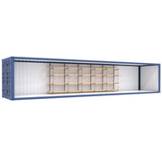 La structure de ce support d'étagère s'accroche aux points d'arrimage internes d'un conteneur standard de 20 pieds (6 mètres).